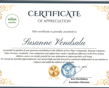 Me llamo Susanne Vendsalu. Soy artista multidisciplinaria y desde hace muchos años me he dedicado por completo a ayudar a la gente de la Camboya rural. Era joven cuando los Jemeres Rojos, bajo el régimen de Pol Pot, aterrorizaron, torturaron y asesinaron a entre un cuarto y un tercio de su población entre 1975 y 1979. Este genocidio nunca ha abandonado mi mente, por lo que he viajado varias veces por el país, enamorándome de él y de su gente. He visitado las imponentes ruinas de Angkor Wat, los Campos de la Muerte y el horroroso Museo del Genocidio Tuol Sleng S21 en Phnom Penh. Durante muchos años he apadrinado a una niña, Sonita, y la he ayudado a ella, a su familia y a la escuela a la que asiste en la comunidad de Roneam, Takeo, situada cerca de la frontera con Vietnam, al sur. Fui miembro de la organización española de ayuda Global Humanitaria, que lamentablemente ahora ha abandonado Camboya. Mi decisión es quedarme y trabajar directamente con organizaciones sin ánimo de lucro en el país. Mi primera recaudación de fondos en 2024 recaudó 2500 dólares y, de forma privada, aporté mucho más para ayudar al pueblo, a la familia de Sonita y a la escuela.